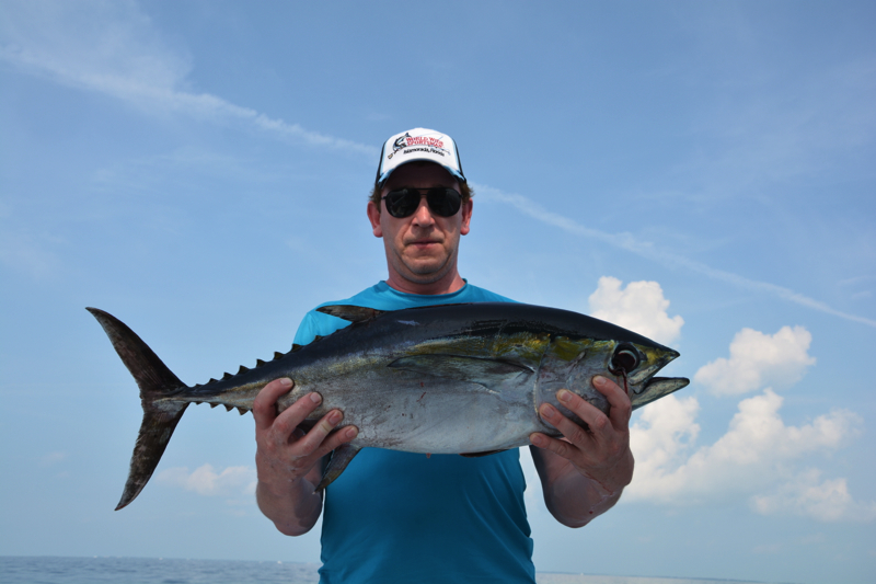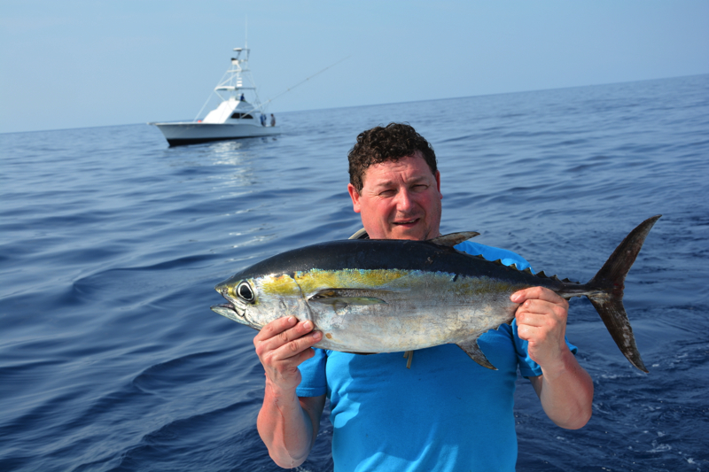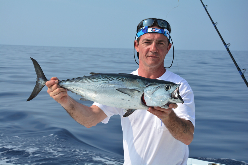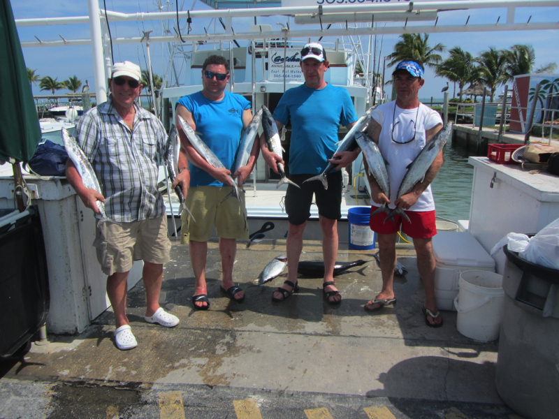 4°dag: We stonden iets vroeger op om wat boodschappen te doen ( het was hier namelijk dorstig weer) hahaha, en reden dan naar Mel zijn boot de Gotcha. Daar stond zijn dekmate reeds te trappelen van enthousiasme. Iets vroeger of normaal verlieten we het dock, en na overleg beslisten we op kingfish en dergelijke te beginnen en zagen dan wel wat er op het water gebeurde. We beseften heel goed dat het sailfish seizoen reeds was gepasseerd, en de dorados nog klein waren in deze periode van het jaar. Dus met deze gedachte zijn we aasvissen wezen vangen. Dat de koningsmakreel er zat was meer dan duidelijk, want al van bij het begin was het beet na beet, gemengd met little tuna, en blackfin tuna was onze limiet van 8 kings al gauw bereikt. We beslisten dan om te proberen op vermillion snappers die op zo een 80 meters diepte zouden te vangen zijn, maar dit viel tegen. We kregen in de diepte geen beet, en beslisten om iets anders te proberen. Op de terugweg kruisten we een grote groep enorme permits die boven een wrak fourageerden, maar ook die gaven verstek. Dan trolden we terug slow speed, en de kings waren er direct weer van de partij. Voldaan gingen we de tiki bar weer bezoeken, waar we Jerremy op visite mochten verwelkomen. Na enkele biertjes mochten we onze gefileerde tonijn en koningsmakreel ophalen bij Mel. Hij had zelfs een filet voor Jerremy klaar, die daar ook tevreden mee was en er een leuk diner aan had. Wij gaan deze vanavond laten klaarmaken bij Lazy days. En dat dit een super idee was mag gezegd worden. Levend verse sushi, tonijnsteaks op de gril, en kingmackerel op 3 wijzen klaargemaakt, en dit met een lekker wijntje op een terras terwijl het 25 graden was, wat kan een mens nog meer verlangen?.