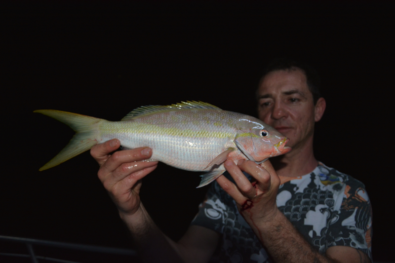 We aten bij Robby’s het diner, maar het moest snel gaan, want een uurtje later stonden we alweer klaar om de nacht-fishing aan te vatten. We vaarden ongeveer de zelfde kant op, maar deze keer visten we anders, namelijk free linning. Dit leverde andere en grotere soorten op. De yellowtails waren een stuk agresiever en je ving er andere rovers mee. Op de bodem waren er nu ook andere soorten te vangen met stukjes octopus, een stuk of een hele aasvis. Samen hadden we zowat een 100 tal vissen bij elkaar gehengeld, wat ons meer dan tevreden stelde. Moe maar voldaan reden we nadien naar onze kamer waar we als een blok in slaap vielen, en droomden over de vissen die we vandaag vingen, maar ook over deze die we morgen mischien zouden vangen.