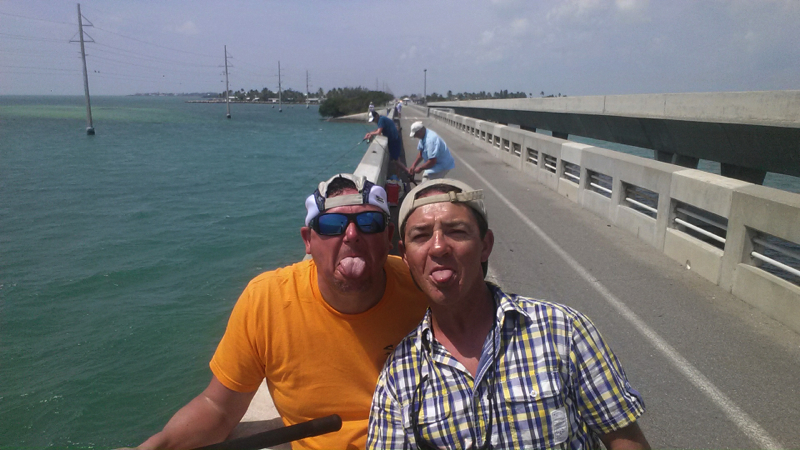 5°dag: We hadden vandaag een vrije dag, en na overleg beslisten we om: te gaan vissen (rare jongens toch die belgen). Gisteren sprak Mel over een zoetwater kanaal op een half uur rijden noordwaarts waar er black bass, peacock bass, oscars en chicliden alsook andere zoetwatervissen zwemden, dus we hadden een nieuwe missie. We zijn wezen ontbijten, na een tip van Jerremy op een terrasje aan het water waar het inderdaad zeer lekker was, en begeefden ons dan noordwaarts. Eenmaal de plaats bereikt zagen we al vlug dat Mel niet had gelogen, je zag overal de soorten die ik vermelde. Maar vangen!!!! Dat was een ander paar mouwen. Iedere vis die we spotten volgden onze kunstaasjes tot aan onze voeten, maar geen enkele konden we haken. We hadden gewoonweg niet de juiste spullen bij, jammer. Ook hadden we vergeten om drank mee te doen, en in de verzegende hitte gaven we er de brui aan. We besloten om terug te rijden naar de midden keys om er op of onder de bruggen te gaan vissen, wat wel een succes was. Je ving er de ene na de andere aquariumvis in alle mogelijk kleuren. Na de vele uurtje zon die onze huidjes al behoorlijk hadden verkleurd namen we met plezier gebruik van het zwembad die bij het domein behoord. Deze avond zijn we wezen eten bij hoggs heaven en dronken erna nog wat biertjes aan hun schitterend terras en haventje waar je honderden vissen kan aanschouwen.