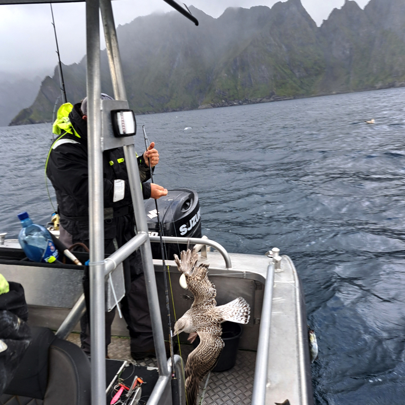 Tijdens het varen zien we ineens heel veel meeuwen bij elkaar vliegen dus wij staan gelijk op scherp. Hup dat stuur omdraaien en achter die meeuwen aan. Het maakt niet uit wat je in het water gooit en er zit gelijk een mooie koolvis aan. Ook deze vissen blijven me verbazen hoe sterk ze zijn. Het gekke deze dag is dat we in de Moskenesstraumen vissen en er gewoon nul stroom is, niet 1 uur maar bijna de hele dag. Morgen ziet het er naar uit dat we niet kunnen vissen.